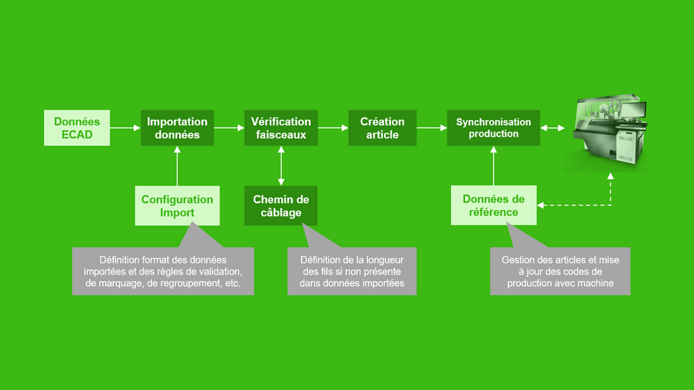 WIRE Mind automatise la préparation des données pour la fabrication de fils et donne de la rigueur au processus. Le logiciel prend en charge le traitement des fichiers de production de manière entièrement automatique, vérifie la conformité des informations et regroupe intelligemment les fils dans l’ordre de montage.